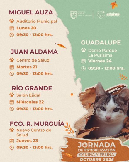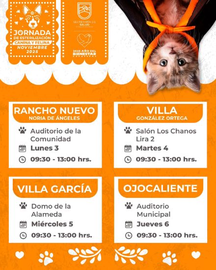Zacatecas, Zac., 2 de noviembre de 2025.- Con el objetivo de mantener controladas las poblaciones canina y felina en la entidad, durante el inicio de mes, personal de la Secretaría de Salud de Zacatecas (SSZ) visitará cuatro municipios a fin de ofrecer cirugías gratuitas para la esterilización de perros y gatos y fomentar, con ello, la cultura de ser dueños responsables.